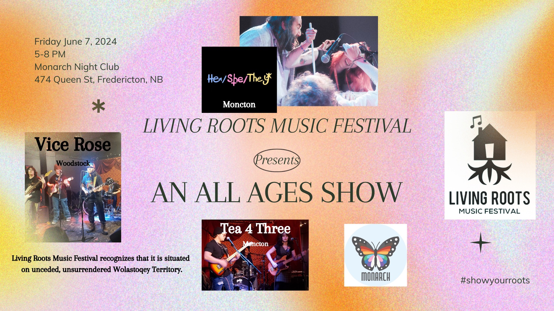 Living Roots- All ages show- He/She/They + Tea 4 Three + Vice Rose at Monarch
