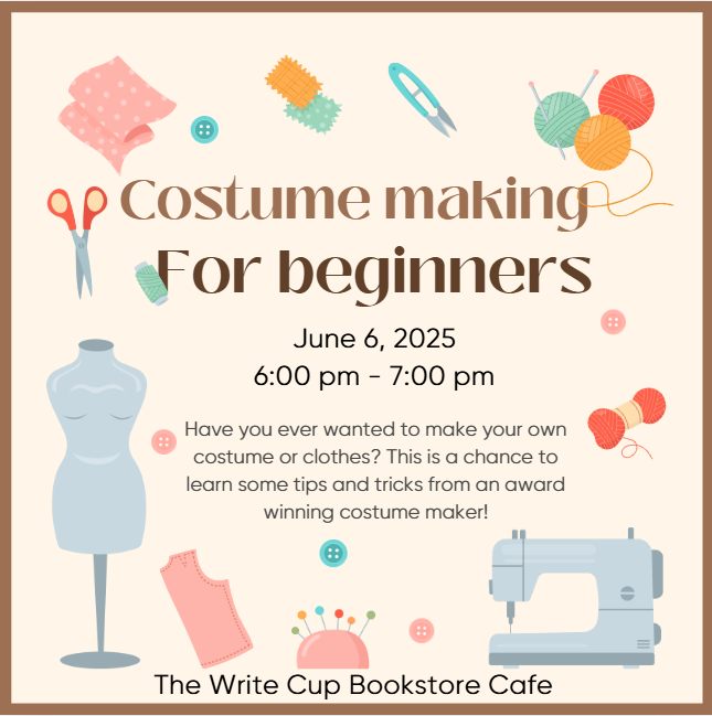 June 6, 2025 @ 6:00 pm - 9:00 pm Costume Making for Beginners workshop The Write Cup Bookstore Cafe 1 Market Square, Saint John, New Brunswick, Canada ArtCafeCosplayCraftsFeaturedSaint JohnTextilesWorkshops+Instruction