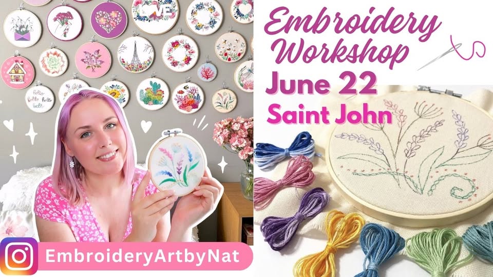 June 23, 2025 @ 6:30 pm - 8:30 pm Embroidery Basics: Evening Workshop 99 Forest Hill Drive, Saint John, NB, Canada, New Brunswick Forest Hill Drive 99, Saint John, New Brunswick, Canada ArtCraftsFeaturedLocal BusinessSaint JohnTextilesWorkshops+Instruction
