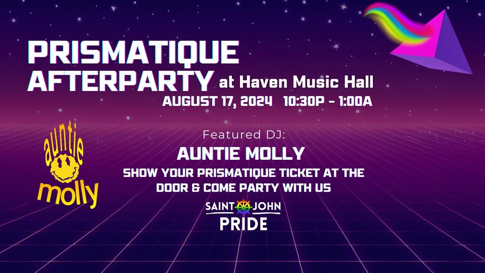 August 17, 2024 @ 10:30 pm - 1:30 am Prismatique After Party Haven Music Hall & Cafe 201 Union Street, Saint John, New Brunswick, Canada Accessibility InfoBarDanceDJDragFeaturedLive MusicQueer FriendlySafer Spaces PolicySaint John