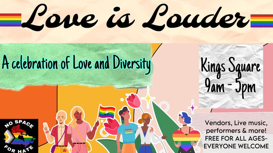 September 20, 2024 @ 9:00 am - 5:00 pm Love is Louder 2024 King's Square 100 King Street, Saint John, New Brunswick, Canada All AgesArtFeaturedLive MusicOutdoorQueer FriendlySaint John