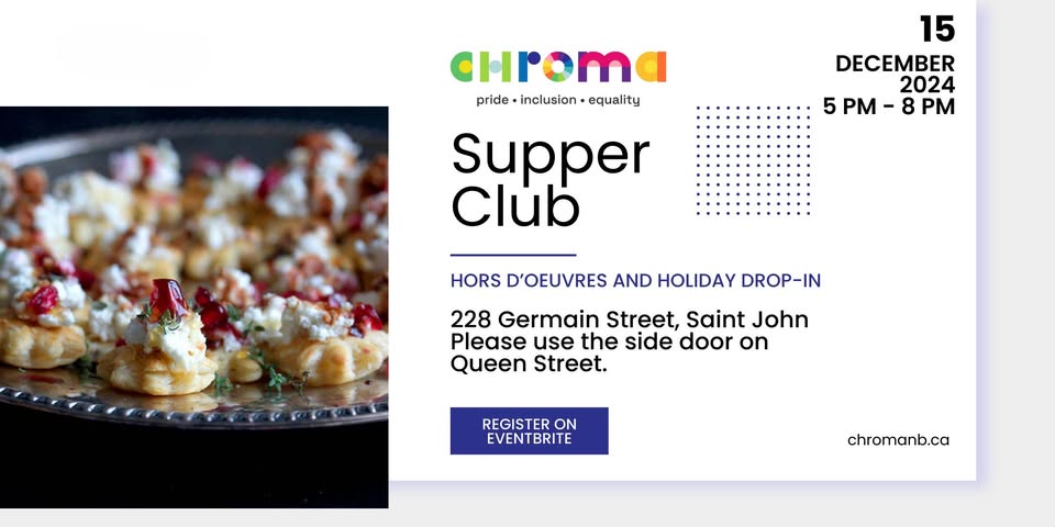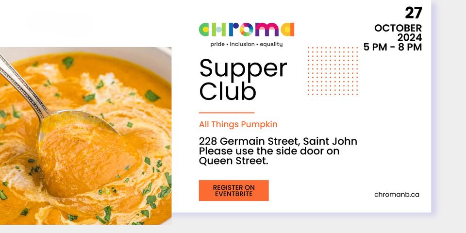 October 27, 2024 @ 5:00 pm - 8:00 pm Chroma’s Supper Club – All Things Pumpkin 🎃🍲 228 Germain St, Saint John, NB E2L 2G4, Canada Germain Street, Saint John, New Brunswick, Canada Accessibility InfoAll AgesClubFeaturedQueer FriendlySaint John