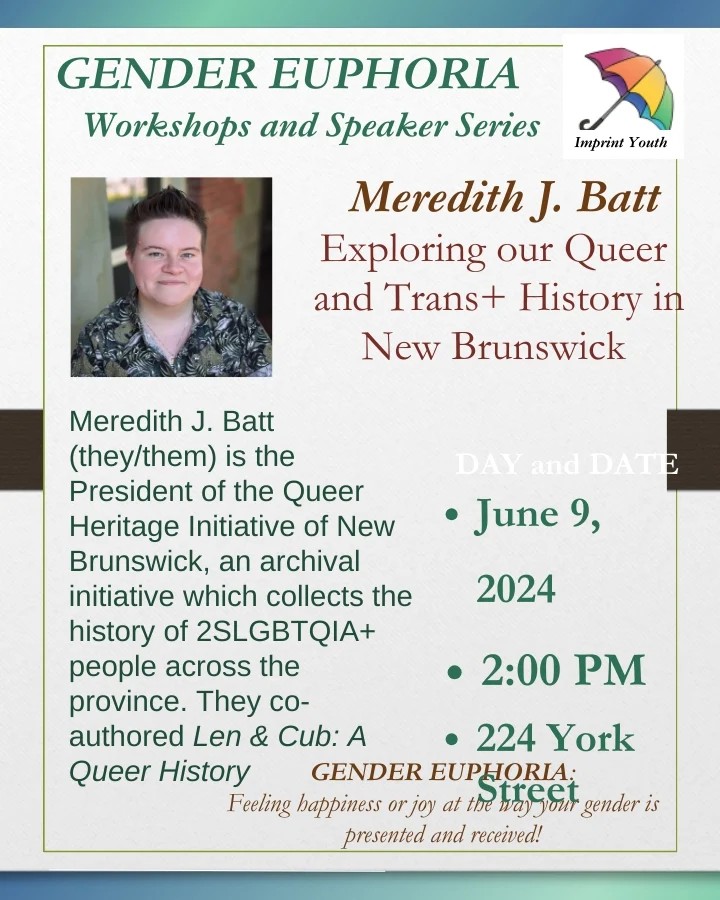 June 9, 2024 @ 2:00 pm - 5:00 pm Exploring our queer and trans+ history in New Brunswick Imprint Youth Association Fredericton, New Brunswick, Canada All AgesFrederictonHistoryLocal BusinessPresentationQueer FriendlySafer Spaces PolicyTalks & Spoken Word