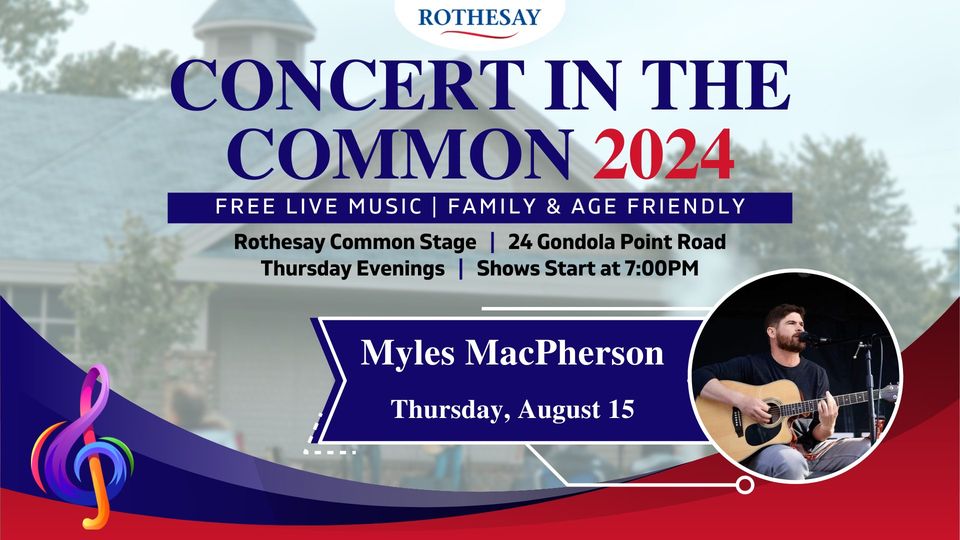 August 15, 2024 @ 7:00 pm - 10:00 pm Myles MacPherson – Concert in the Common 2024 – FREE LIVE MUSIC Rothesay Common 24 Gondola Point Road, Rothesay, New Brunswick, Canada FestivalsJazz+BluesLive MusicLocal+Regional ArtistsOutdoorRock+PunkRothesay+QuispamsisSoul+Funk