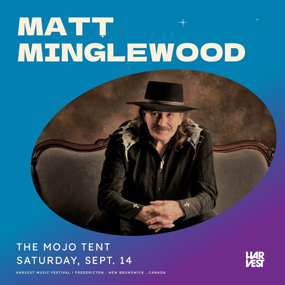 September 14, 2024 @ 10:15 am - 1:15 pm Matt Minglewood Band Harvest Music Festival Fredericton NB TD Mojo Tent Queen Street, Fredericton, New Brunswick, Canada FeaturedFestivalsFrederictonHarvest Music FestivalJazz+BluesLive MusicOutdoorSinging