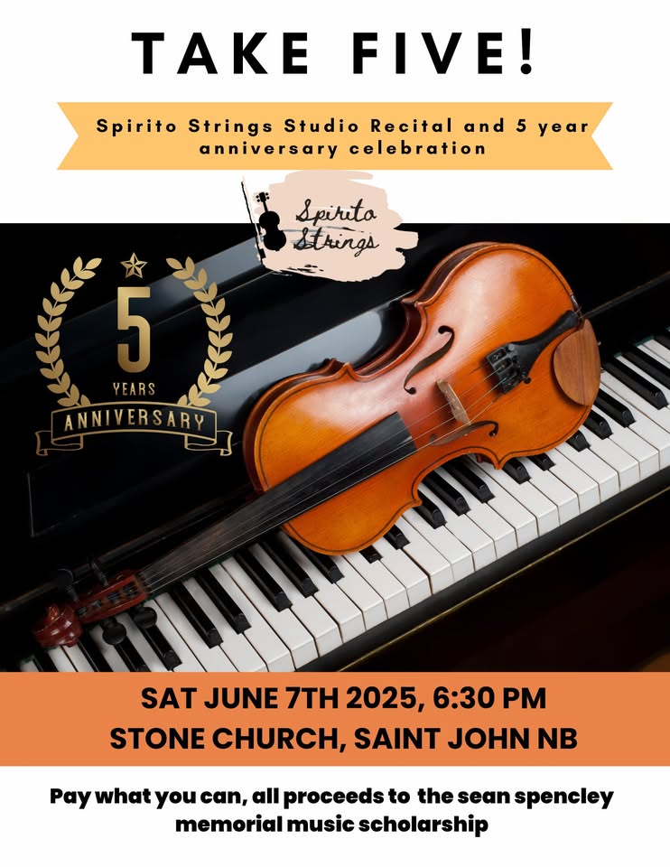 June 7, 2025 @ 6:30 pm - 9:30 pm TAKE FIVE: Spirito Strings Recital and 5 Year Anniversary Stone Messy Church ChurchFeaturedLive MusicSaint John